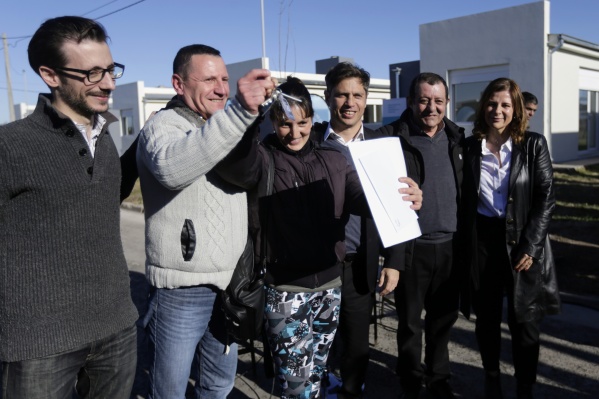 El gobernador de la provincia de Buenos Aires, Axel Kicillof, encabezó esta tarde el acto de entrega de 40 viviendas en el barrio Lafuente de Benito Juárez, acompañado por el ministro de Hábitat y Desarrollo Urbano, Agustín Simone; y el intendente local, Julio Marini. Además, junto a la presidenta del Instituto Cultural bonaerense, Florencia Saintout, otorgaron cuadros y bibliotecas para las nuevas casas.