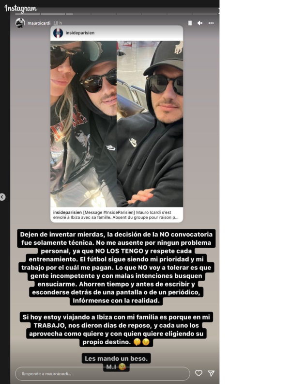 Además de las postales juntos en Ibiza, Icardi realizó un picante posteo en sus redes: "Dejen de inventar mierdas, la decisión de la no convocatoria fue solamente técnica", comenzó diciendo.