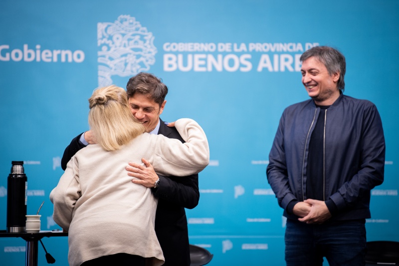 El gobernador de la provincia de Buenos Aires, Axel Kicillof, el diputado nacional Máximo Kirchner y la directora ejecutiva de la ANSES, Fernanda Raverta, encabezaron esta tarde el acto por el primer aniversario de la puesta en marcha del Programa de Reconocimiento de Aportes por Tareas de Cuidado.