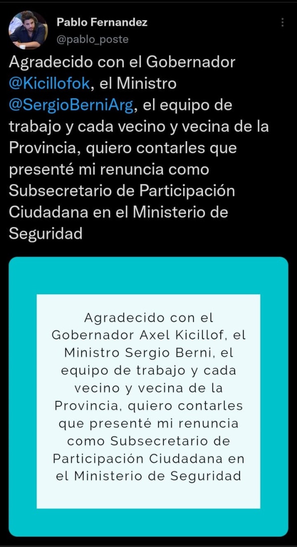 El Subsecretario de Participación Ciudadana del Ministerio de Seguridad bonaerense, Pablo Fernández, presentó su renuncia al cargo.