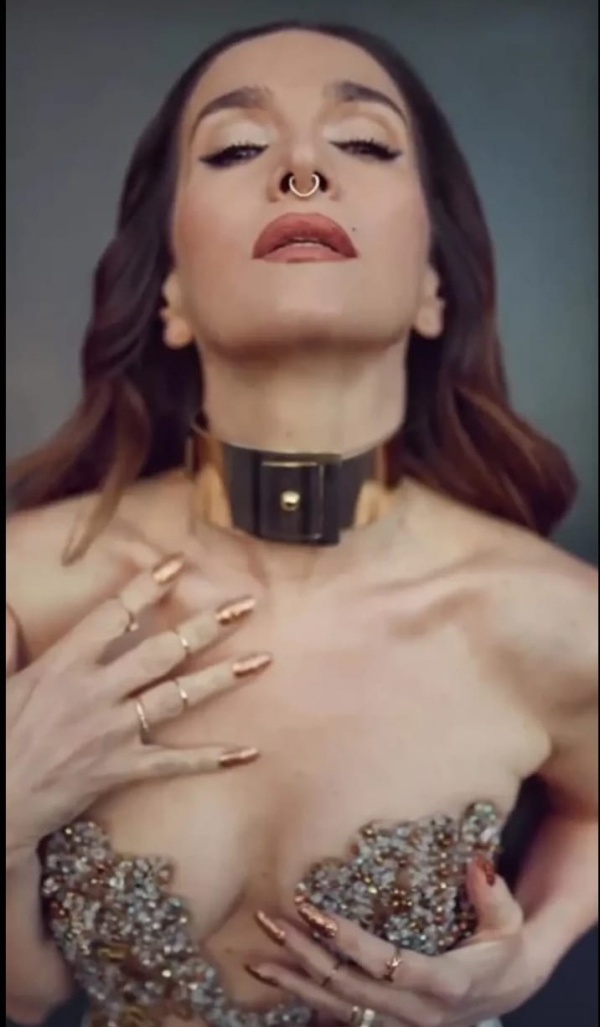 Con un traje blanco con un corset dorado, con detalles y brillos, y un collar en combinación con su nuevo arito en la nariz, deslumbro la pantalla de la televisión uruguaya.