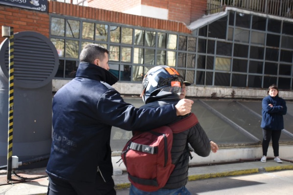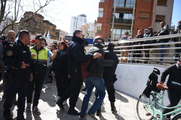 Pasadas las 12, el motociclista irrumpió en la movilización y se generó un tenso momento con insultos y empujones. Finalmente, la intervención de la policía trajo algo de calma.