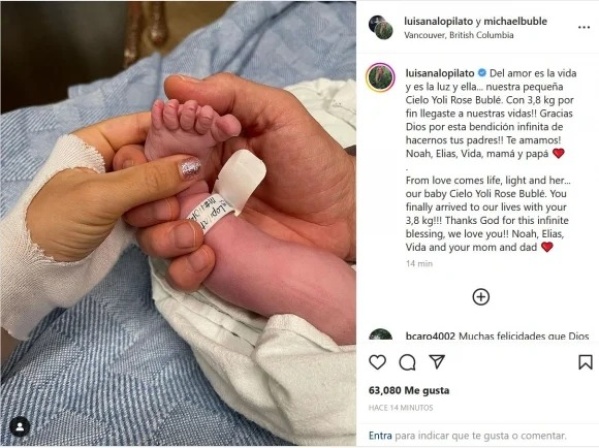 "Del amor es la vida y es la luz y ella... Nuestra pequeña Cielo Yoli Rose Bublé. Con 3,8 kg por fin llegaste a nuestras vidas. ¡Gracias, Dios, por esta bendición infinita de hacernos tus padres! ¡Te amamos! Noah, Elias, Vida, mamá y papá", expresaron Luisana Lopilato y Michael Bublé en un comunicado compartido.