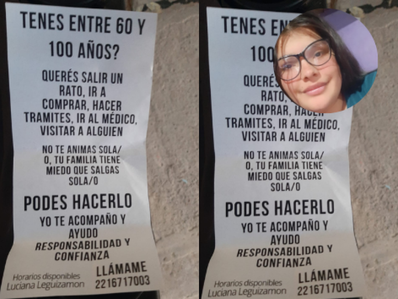 El flyer que fue repartido por toda la ciudad dice “Tenes entre 60 y 100 años? Queres salir un rato, ir a comprar, hacer trámites, ir al médico, visitar a alguien. No te animas sola/o, tu familia tiene miedo a que salgas sola/o. PODES HACERLO, yo te acompaño y ayudo. Responsabilidad y confianza”.