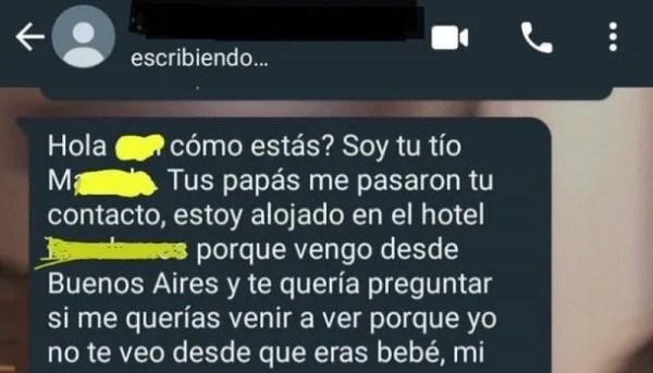 “Te quería preguntar si me querías venir a ver, porque yo no te veo desde que eras un bebé. Mi habitación es la 77 y tiene una cama grande para vos y para mí”, decía el mensaje que fue aportado como prueba por el matrimonio en la Justicia, y que compartieron también en una entrevista con el portal Ahora Calafate.
