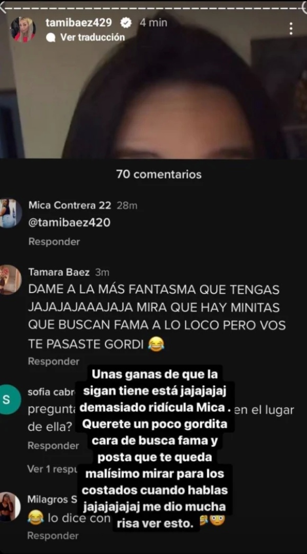 En este sentido, Tamara aclaró: "Unas ganas de que la sigan a esta ja, ja, ja... Demasiado ridícula, Mica, querete un poco gordita cara de busca fama. Y posta que te queda malísimo mirar para los costados cuando hablás ja, ja, ja, me dio mucha risa ver esto".