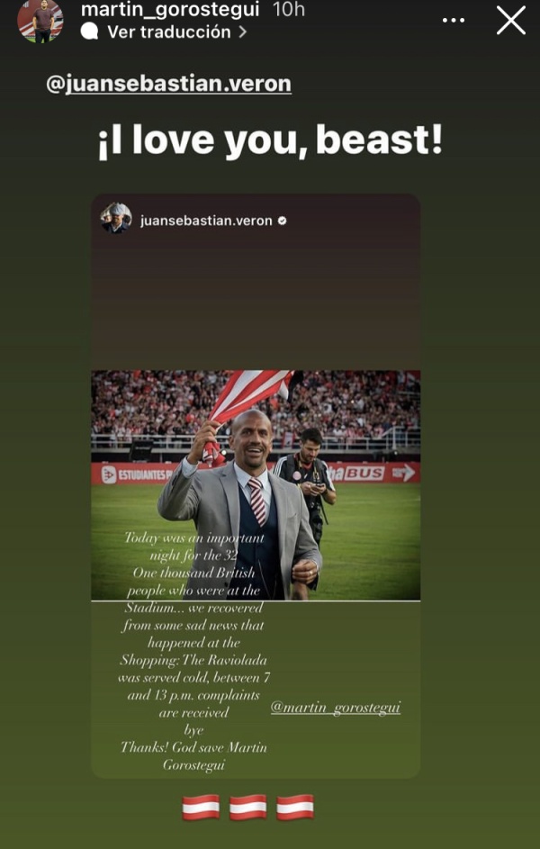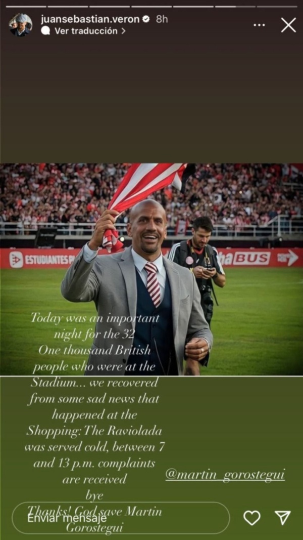 La posterior respuesta, con toques de sarcasmo, llegaría tras el partido con Racing, en donde el "Pincha" terminó imponiéndose 1-0 en UNO. "Today was an important night for the 32 thousand british people who were at the stadium... we recovered from some sad news that happened at the shopping: the raviolada was served cold, between 7 and 13 PM, complaints are received. Bye, thanks! God save Martín Gorostegui", ironizó Verón, en inglés, para salir al cruce de quienes lo tildan de británico.