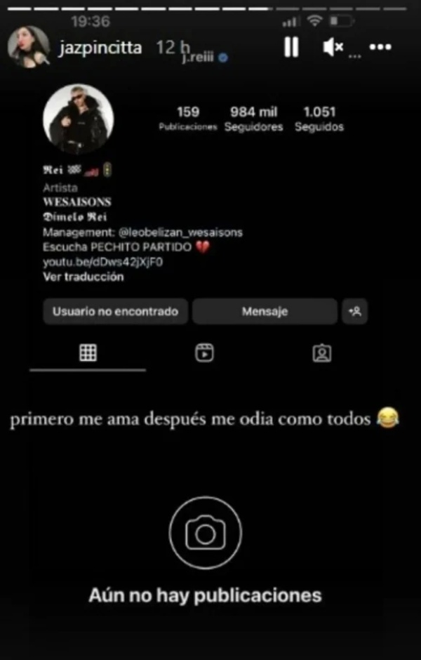 Jazpincita, mostró que J Rei la bloqueó en Instagram y agregó: "Primero me ama y después me odia, como todos".
