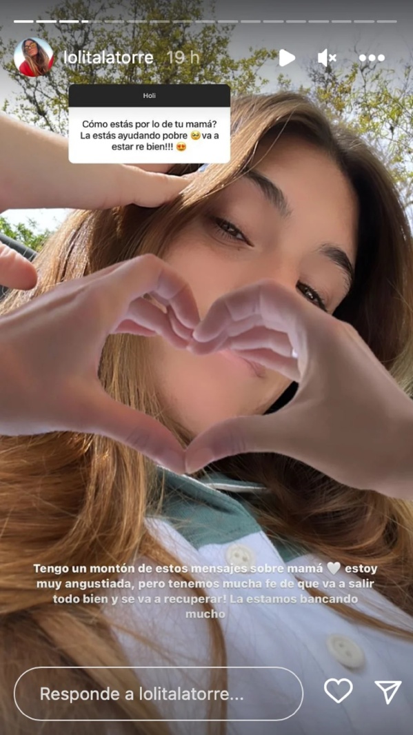 Inmediatamente, Lola contestó la duda de su seguidor: “Tengo un montón de estos mensajes sobre mamá. Estoy muy angustiada, pero tenemos mucha fe de que va a salir todo bien y se va a recuperar. La estamos bancando mucho”.