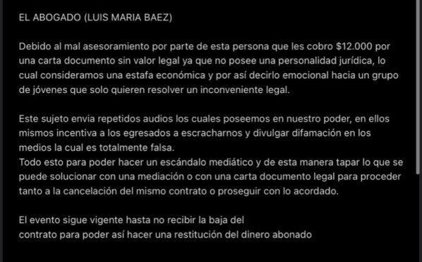 “Porque nosotros armamos eventos, no los desarmamos”, sentenció. Es acá donde él señaló a este medio donde empieza a surgir un “teléfono descompuesto” sobre la situación contractual. Siendo el señalado anteriormente el primer factor que después deriva en el envío de una carta a documento por parte del abogado Luis María, en representación de los padres que no entendieron las formalidades del acuerdo.