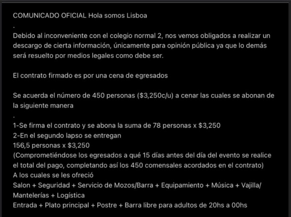 El segundo factor, fueron los dos impuestos que debían correr por parte de las familias. Uno corresponde a la música, si quieren que se pase en la fiesta, y se lo deben pagar a los músicos; el otro es un impuesto social que se cobra a cada evento de este ámbito y al ser una cena de egresados se debe abonar.