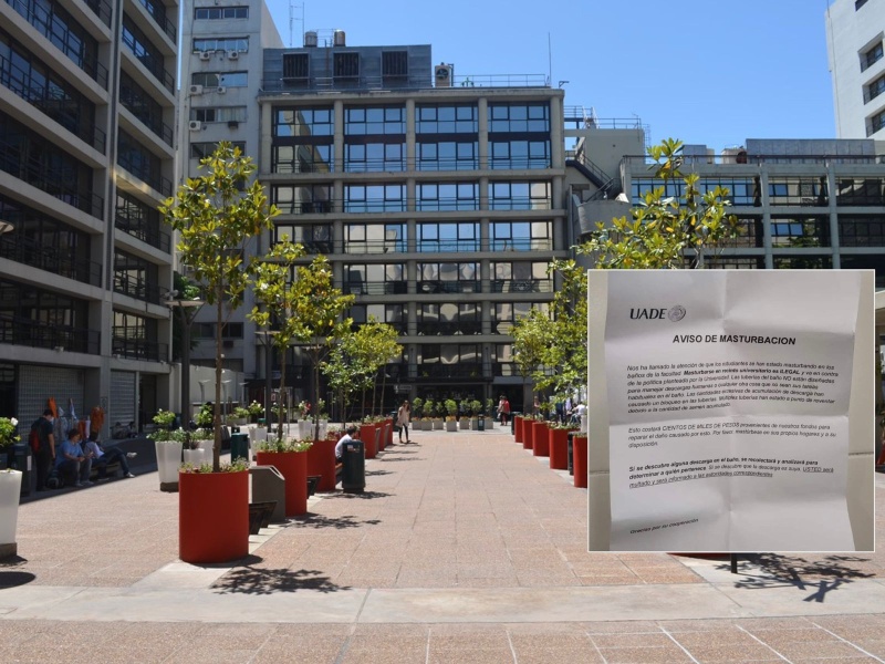 Luego de que uno de los estudiantes de la propia UADE sacó una foto y la publicó, la noticia tomó se hizo viral: "Nos han llamado la atención de que los estudiantes se han estado masturbando en los baños de la facultad. Masturbarse en recinto universitario es ILEGAL y va en contra de la política planteada por la Universidad", señalaron en el comienzo del comunciado.