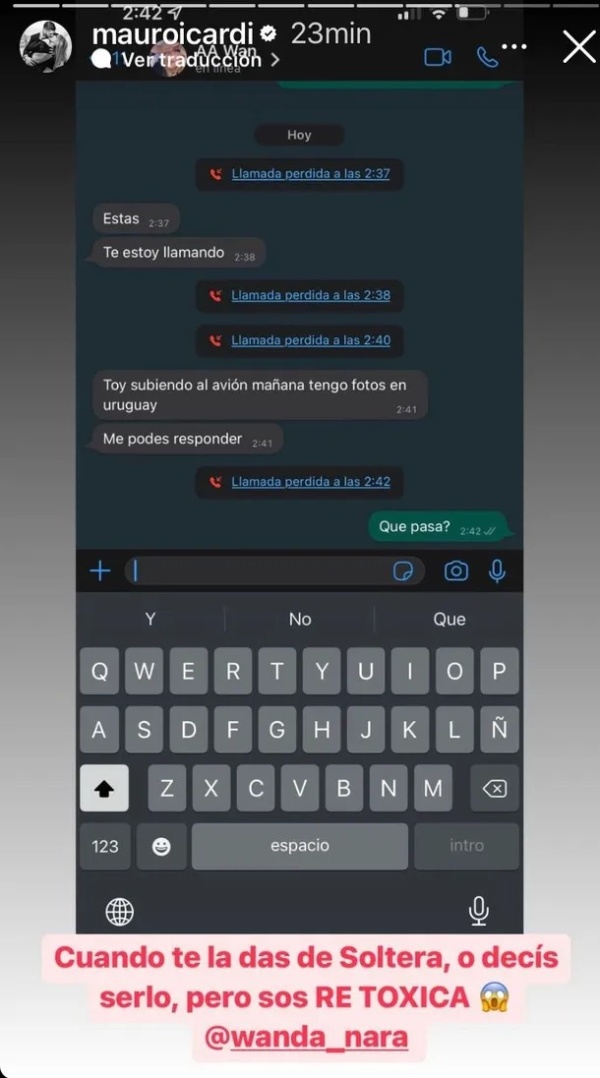 El primer chat que subió Icardi hay 3 llamadas perdidas de Wanda, que en 3 minutos le marcó tres veces para comunicarse.