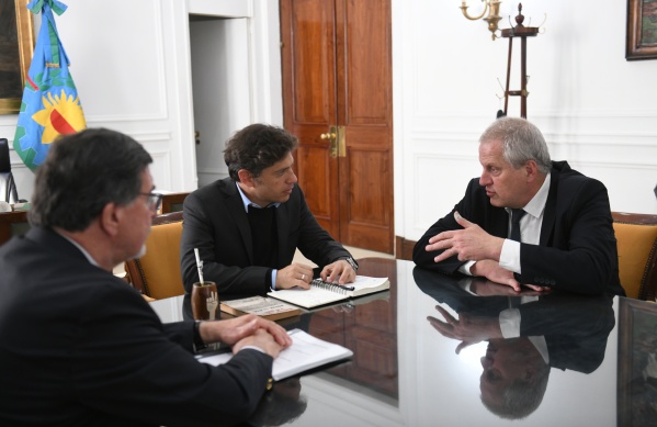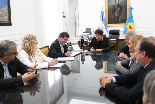 El gobernador Axel Kicillof encabezó esta tarde una reunión con el ministro de Educación de la Nación, Jaime Perczyk, y el director general de Cultura y Educación, Alberto Sileoni, en la que se suscribió un convenio para ampliar la jornada educativa en escuelas primarias de gestión estatal de la provincia de Buenos Aires.