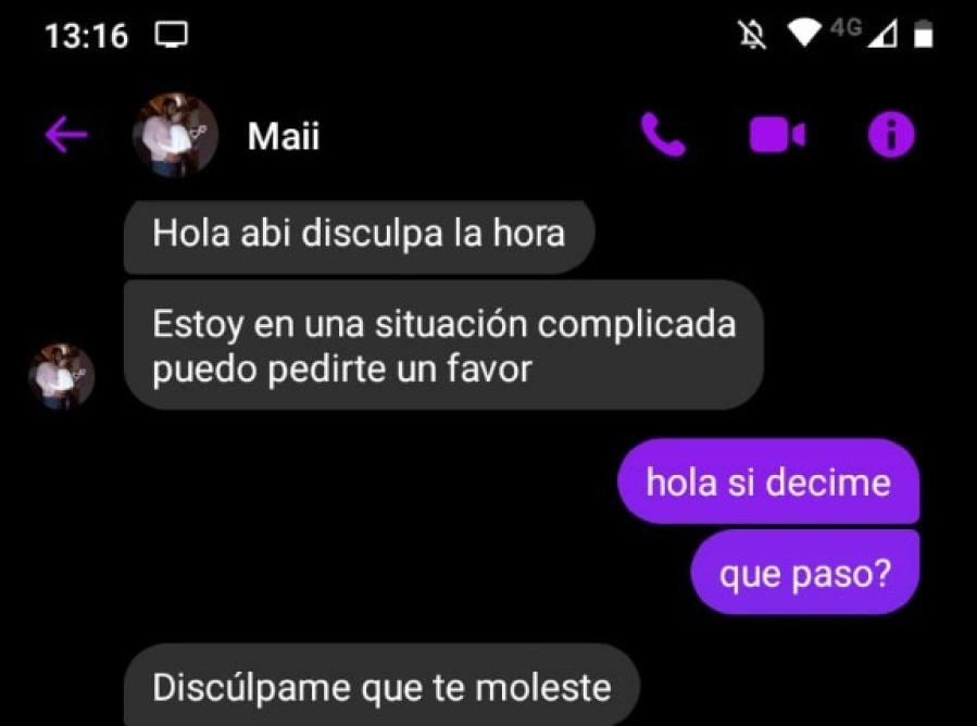 Todo comenzó con una chica que le envió un mensaje a la vecina Abii Rios, donde le pedía prestado plata bajo la excusa de que su beba estaba enferma y necesitaba el dinero para llevarla, de urgencia, al hospital, “Hola abii, disculpa la hora, estoy en una situación complicada, puedo pedirte un favor?” fue el mensaje que le llegó por parte de la estafadora.