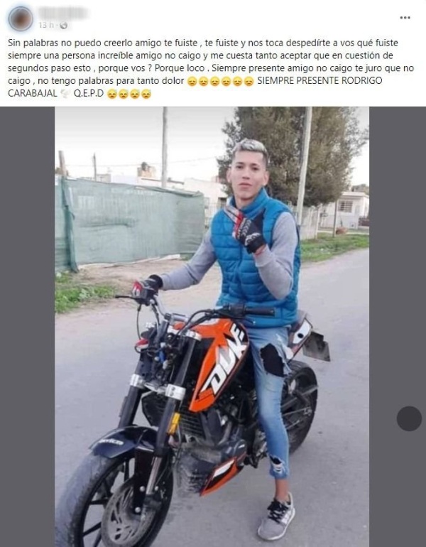 Según trascendió, se identificó al masculino como Rodrigo Carabajal, a quien se lo tenía como un "amante de las motos".