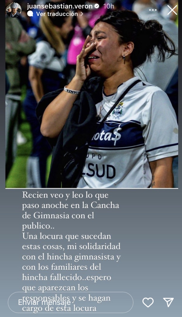 "Recién veo y leo lo que pasó anoche en la cancha de #GELP con el público. Una locura que sucedan estas cosas, mi solidaridad con el hincha gimnasista y con los familiares del hincha fallecido. Espero que aparezcan los responsables y se hagan cargo de esta locura", afirmó la "Brujita", con una historia que compartió en su cuenta de Instagram. El texto está acompañado de una imagen, en donde se puede ver a un hincha del "Lobo" llorando, producto de la situación vivida.