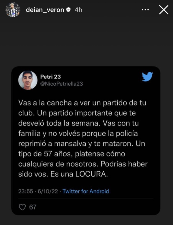 Otro integrante de la familia Verón que también se indingó con la situación fue Deian, el hijo de Juan Sebastián. "Vas a la cancha a ver un partido de tu club. Un partido importante que te desveló toda la semana. Vas con tu familia y no volvés porque la policía reprimió a mansalva y te mataron. Un tipo de 57 años, platense como cualquiera de nosotros. Podrías haber sido vos. Es una locura", compartió el futbolista de Central Córdoba en su Instagram, replicando el tweet del usuario @NicoPetriella23.