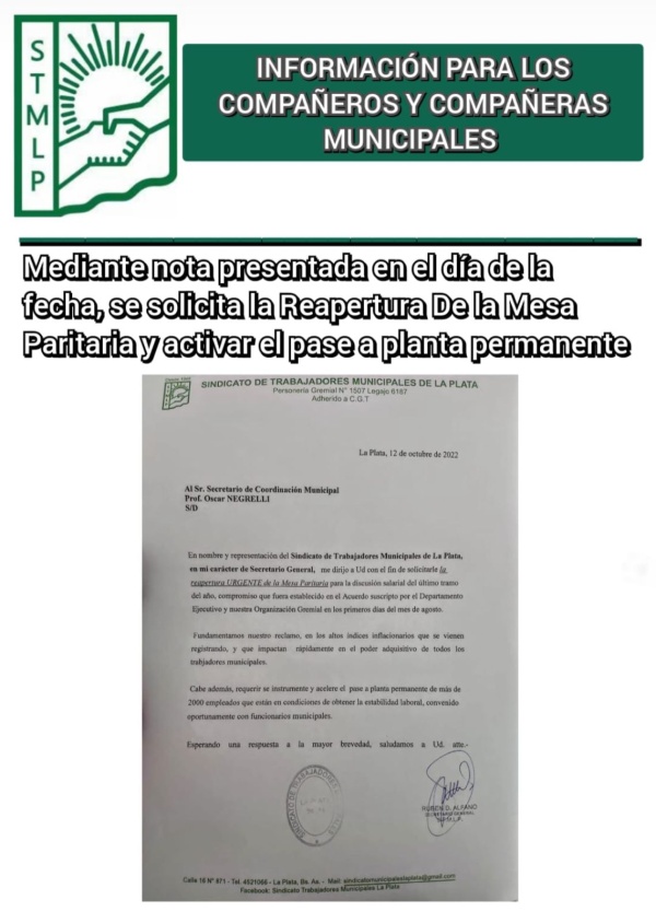 “En nombre y representación del Sindicato de Trabajadores Municipales de La Plata, en mi carácter de Secretario General, me dirijo a Ud. con el fin de solicitarle la reapertura urgente de la Mesa Paritaria para la discusión salarial del último tramo del año”, expresaba en el documenta firmado por Rubén Alfano, Secreatrio General del gremio.