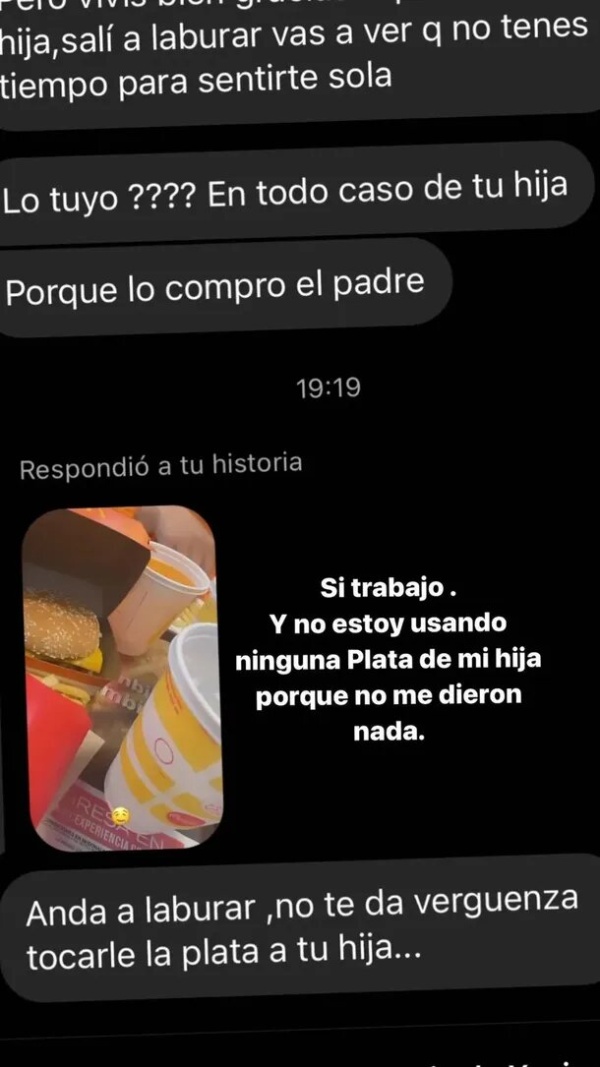 En este sentido, en las últimas horas la influencer compartió una foto en sus redes sociales cenando en una reconocida casa de comidas rápidas, algo que despertó el enojo de un usuario que le reclamó: “Andá a laburar. ¿No te da vergüenza tocarle la plata a tu hija?”.