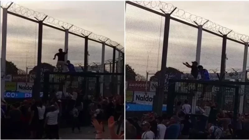 Mientras festejaban el gran desempeño de los jugadores en la cancha, un grupo de futboleros desvió su atención, al ver a una persona colgada de las rejas de la cancha del Club Atlético Sarmiento en Junín.