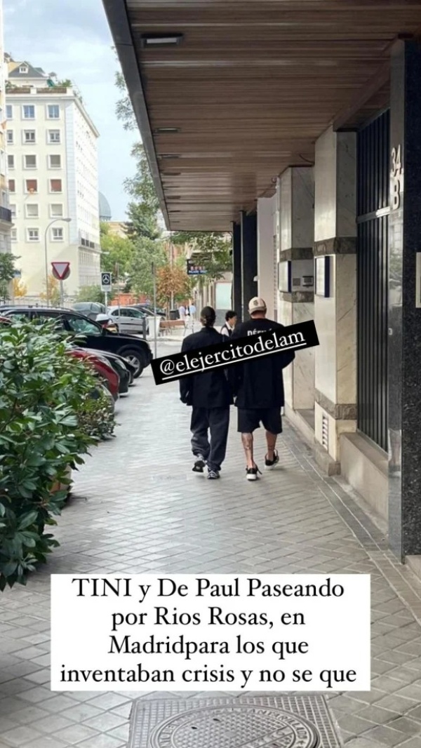 “Tini y De Paul paseando por Ríos Rosas en Madrid para los que inventaban crisis y no sé qué”, se despachó el periodista, junto a una imagen de la pareja, de espaldas, ella con un look oversize y él, de bermudas y gorra.