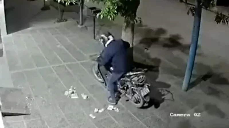 En ese momento, se pudo observar que agarró solo una parte de lo recaudado y el resto quedó sobre el suelo. Como si eso fuera poco, la moto no le arrancaba. Después de algunos segundos, logró ponerla en marcha y escapó a toda velocidad.