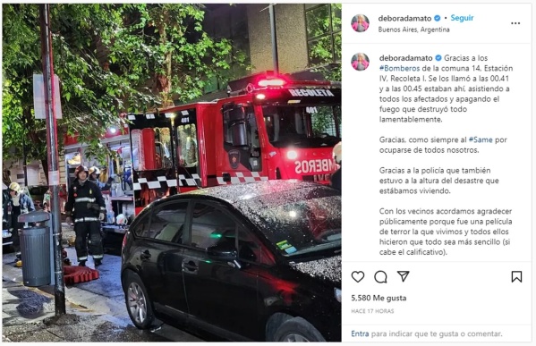 Sobre el estado actual de ella y su hija Lola, D’Amato expresó: “Hoy estamos con el terrible día después. Nosotras estamos bien y regresamos todos a nuestras casas esta mañana tras la aprobación de la fiscalía. Fue una madrugada difícil pero los bomberos, pese a estar en una tragedia, se ocuparon de darles tranquilidad a los chiquitos con una sonrisa”. Y agregó: “Cuando todo estuvo controlado, nos pidieron que acerquemos a los nenes para que vean el camión y no tengan miedo. Increíbles y hermosos seres”.