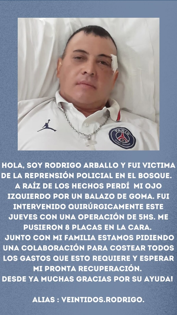 En este marco, el hincha baleado por la policía ya fue operado del ojo que perdió pero solicitó a la comunidad ayuda para afrontar los gastos médicos: “Fui víctima de la represión policial en el bosque, perdí mi ojo izquierdo por un balazo de goma”, dijo el hombre a través de una publicación donde solicitó ayuda.