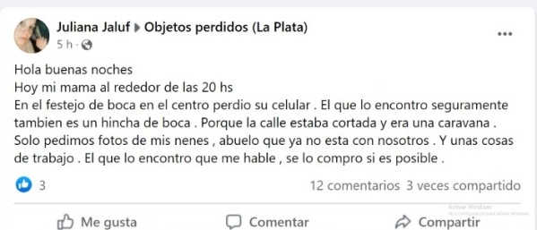La publicación fue hecha en la página de Objetos Perdidos (La Plata), donde contaron “En el festejo de boca en el centro perdió su celular. El que lo encontró seguramente también es un hincha de boca. Porque la calle estaba cortada y era una caravana”.