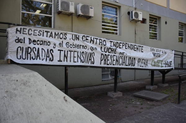 Este martes decidieron hacer visible la situación en las inmediaciones de la Facultad. Se quejan de que todavía hay muchas cursadas vía zoom y por eso reclaman la presencialidad plena.
