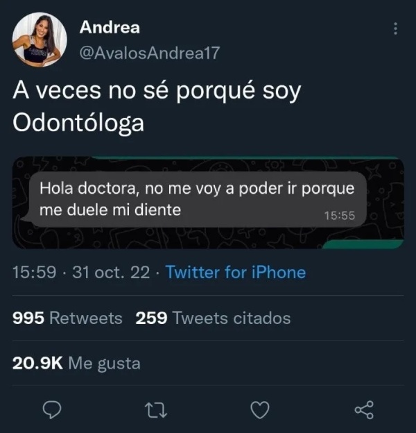Todo se originó cuando la persona se comunicó para cancelar el turno con la dentista con una impensada excusa: “Hola doctora, no voy a poder ir porque me duele mi diente”. Enseguida, su historia se volvió viral y los usuarios aprovecharon a contar experiencias similares donde pacientes faltaban a turnos médicos por problemas de salud que trataban los mismos especialistas. ¡Increible!