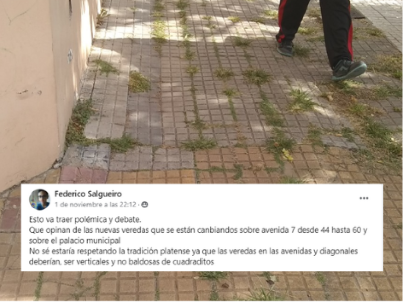 “Qué opinan de las nuevas veredas que se están cambiando sobre Avenida 7 desde 44 hasta 60 y sobre el Palacio Municipal”, fue al pregunta que lanzó el internauta. Y agregó: “No sé estaría respetando la tradición platense, ya que las veredas en las avenidas y diagonales deberían ser verticales y no baldosas de cuadraditos”.
