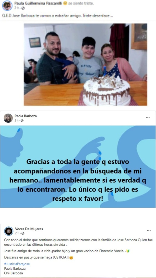 Su hermana Paola Barboza fue quien lo confirmó en sus redes sociales: “Gracias a toda la gente que estuvo acompañándonos en la búsqueda de mi hermano. Lamentablemente si es verdad que lo encontraron. Lo único que les pido es respeto por favor”.