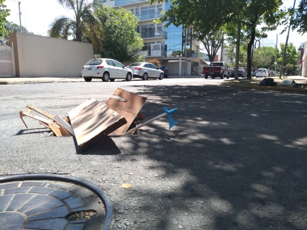 Con maderas y palos taparon un pozo que se encuentra en medio del paso de los vehículos. “Ya varios coches no lo pudieron esquivar o no lo vieron, por eso decidimos salir a taparlo nosotros. No queremos más accidentes”, le expresaba uno de los frentistas a LAPLATA1.com.