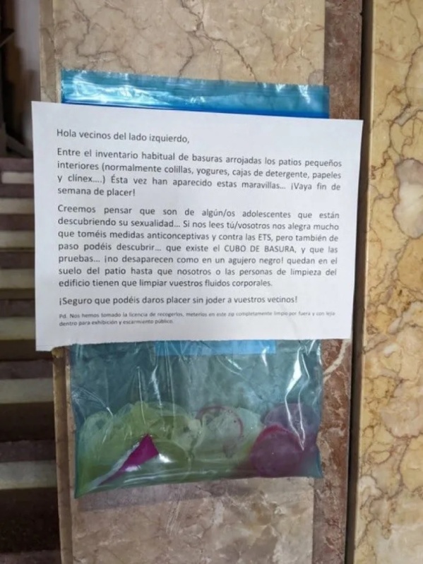 “Si nos lees nos alegra mucho que tomes medidas anticonceptivas y contrala ETS, pero también de paso podés descubrir que existe el CUBO DE BASURA y que las pruebas no desaparecen como en un agujero negro”, se leía a través del furioso cartel. En este sentido, remarcó en que los preservativos usados, de no juntarlos, continúan en el patio del edificio hasta que ellos o las personas encargadas de la limpieza “tienen que limpiar sus fluidos corporales”.
