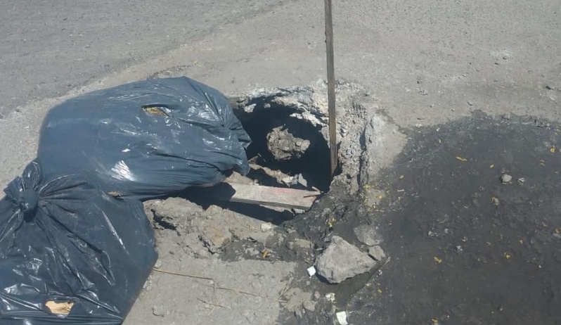 Para evitar accidentes, los frentistas decidieron colocar palos y bolsas para que llame la atención la presencia del mismo.