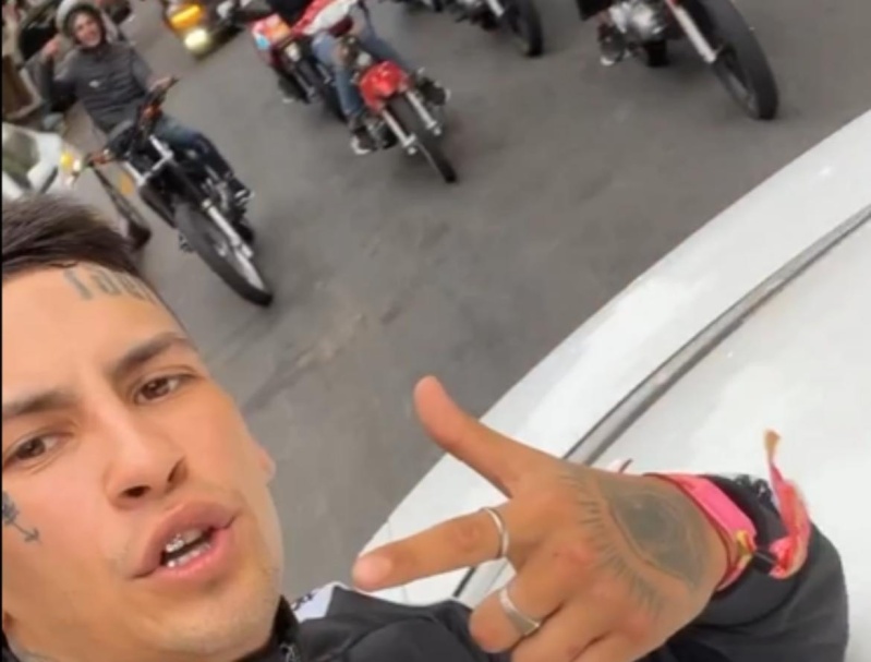 El líder del movimiento Cumbia 420, está con medio cuerpo afuera de un auto. Detrás suyo, se ven motoqueros -algunos sin casco- haciendo "willy" y otras piruetas.