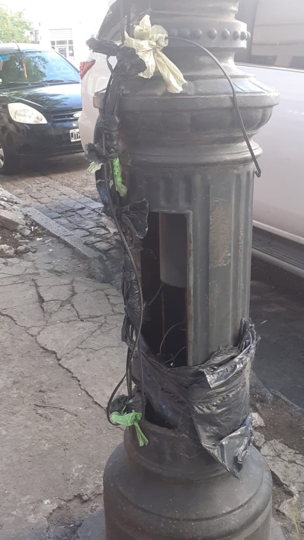 Un poste de luz de la calle 12 y 47 se encuentra en un estado deplorable de abandono, tiene cables cruzados, bolsas y alguien ha enroscado el cable para que ningún transeúnte lo pise.