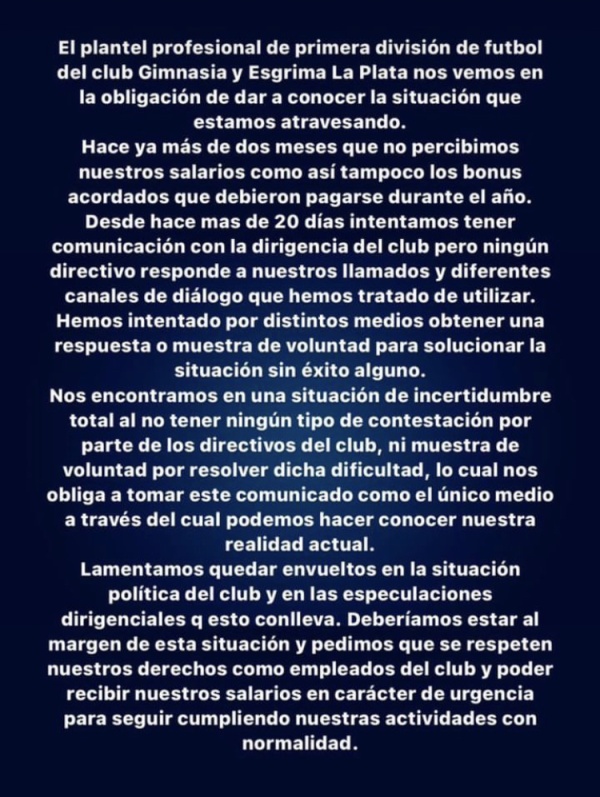 "Nos encontramos en una situación de incertidumbre total al no tener ningún tipo de contestación por parte de los directivos del club, ni muestra de voluntad por resolver dicha dificultad, lo cual nos obliga a tomar este comunicado como el único a través del cual podemos hacer conocer nuestra realidad actual. Lamentamos quedar envueltos en una situación de política del club y en las especulaciones dirigenciales que esto conlleva. Deberíamos estar al margen de esta situación y pedimos que se respeten nuestros derechos como empleados del club y poder recibir nuestros salarios en carácter de urgencia para seguir cumpliendo nuestras actividades con normalidad", concluyeron.