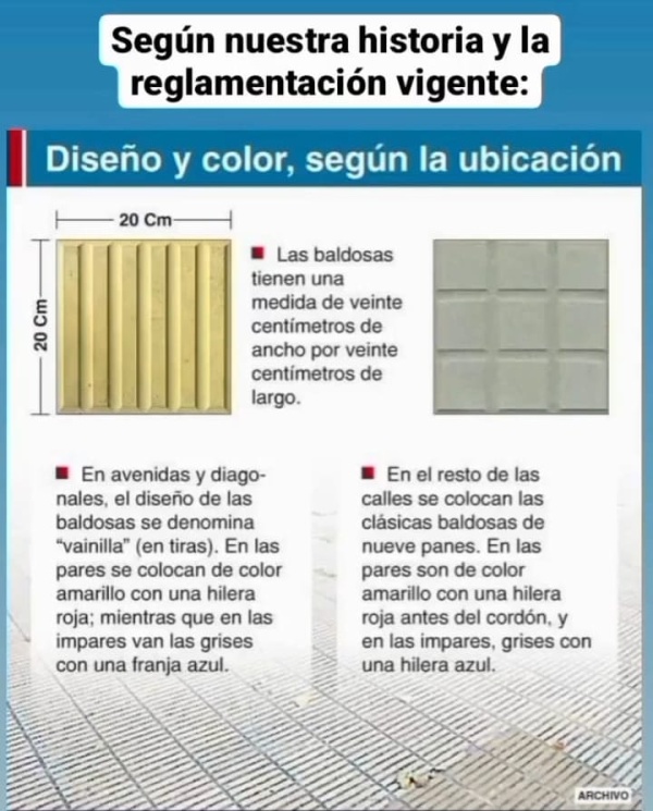 También aclaró: “No es que estemos en contra de que arreglen las veredas sino de que no respeten la tipología y por otro lado no ponen las veredas táctiles para accesibilidad a personas con discapacidad visual”, agregando que “los baldosones blancos de 40 cm x 40 cm que están poniendo van en contra” de lo nombrado anteriormente.
