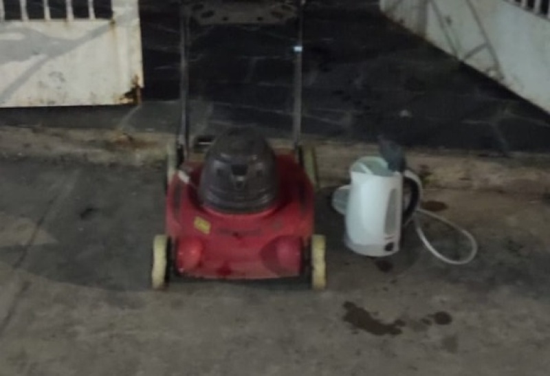 Afuera se encontraban, en la vereda específicamente, una cespedera y una pava eléctrica, que eran parte del motín que estaba sucediendo en la vivienda.