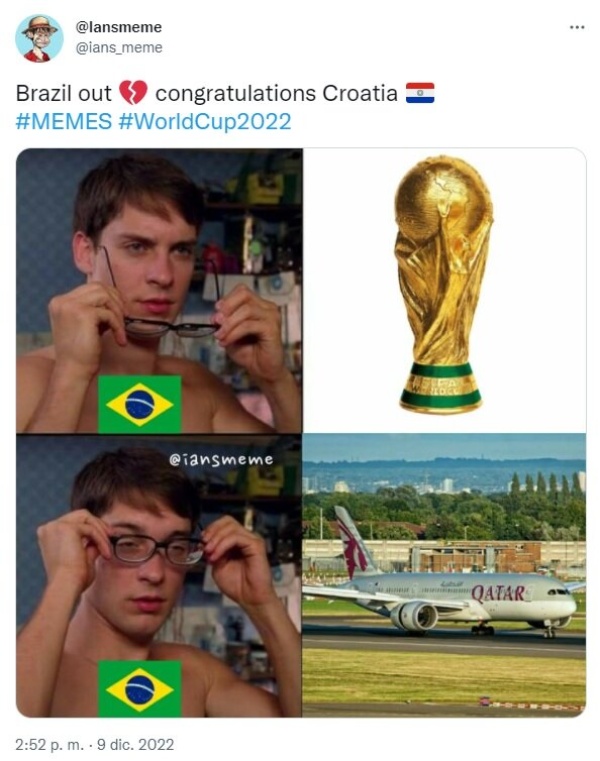 Brasil quedó eliminada de la Copa del Mundo 2022 en Qatar por penales ante Croacia en cuartos de final. Y los memes estallaron. Soprendidos y eufóricos por este inesperado final para el combinado canarinho, los aficionados de la albiceleste reaccionaron en las redes sociales con diversas reacciones y chistes. El conjunto croata se enfrentará con el vencedor del encuentro que jugarán hoy a las 16 Argentina y Países Bajos.