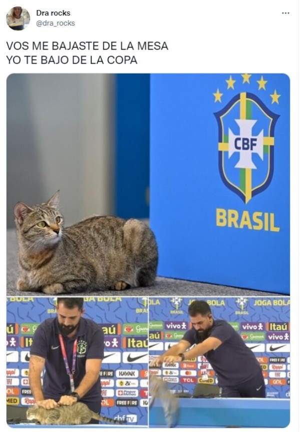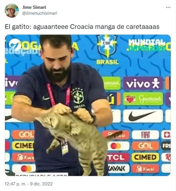 Entre las bromas, se destacaban las que se referían al polémico episodio en la última conferencia de prensa de Vinicius Jr, en la que el jefe de prensa de la selección brasileña, mientras el delantero respondía preguntas, agarró a un gato que apareció en la mesada y lo revoleó de un modo violento para el lado de los periodistas. Los hinchas le adjudicaron al felino el triunfo de Croacia sobre Brasil y lo celebraron de esta manera: