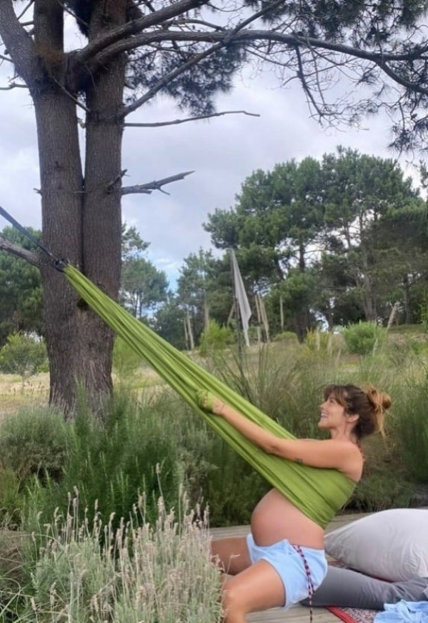 La actriz colgó una especie de tela verde en un poste, la corrió hace adelante y se la puso a la altura del busto. Se animó a colgarse con su pancita hacia abajo y explicó los beneficios de este método.