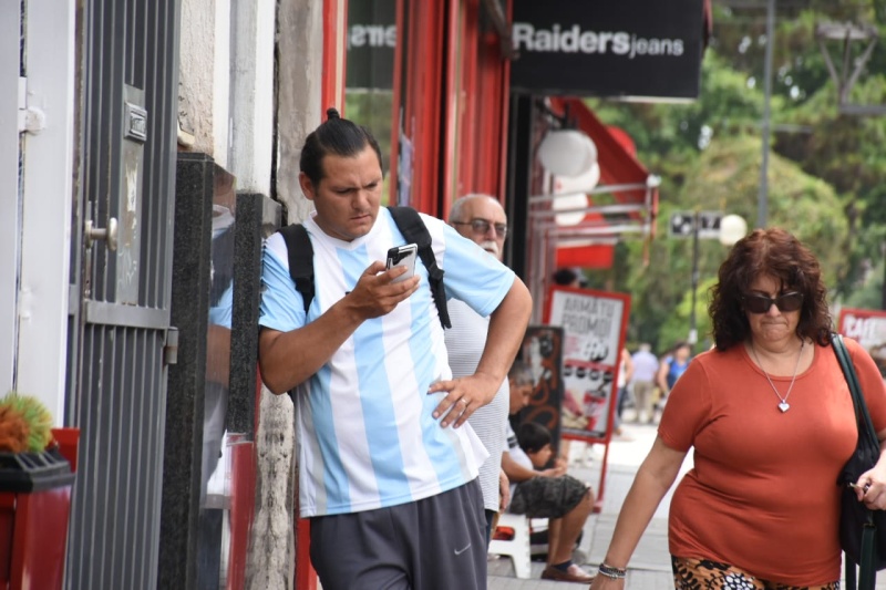 Además de que el tránsito esté acelerado, se observan colas en locales de comida, panaderías y a los vehículos que llevan banderas flameando y a los bocinazos, porque hoy es un día de festejo, pase lo que pase. Transeúntes con las camisetas argentinas, la cuales, en su mayoría llevan la estampa de Messi en la espalda. Y por supuesto, los puestos de venta de casacas y banderas que copan varias esquinas.