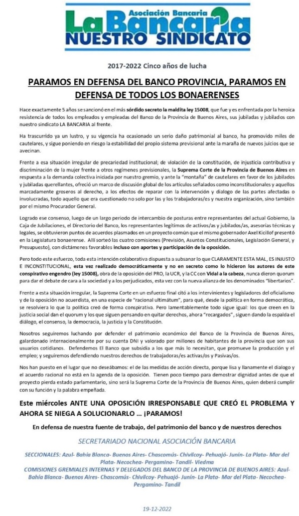Este miércoles habrá un paro en las sucursales del Banco Provincia ante la negativa de la oposición de tratar la reforma jubilatoria solicitada por la Corte Suprema.