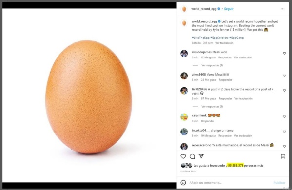 En enero de 2019 la cuenta @world_record_egg, que fue creada con el único objetivo de conseguir la mayor cantidad de likes en la historia, compartió la imagen que acumula 55 millones de “me gusta”.