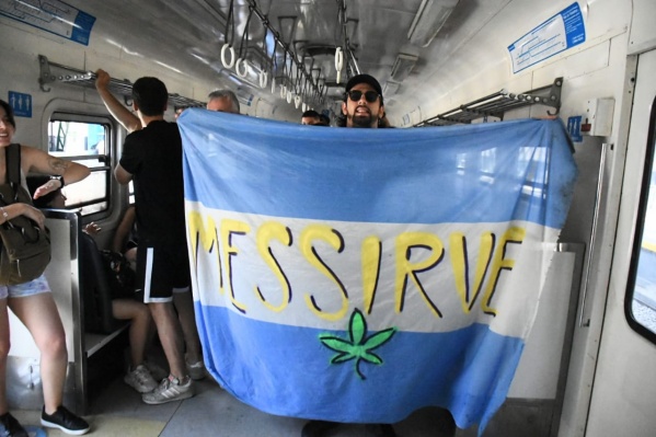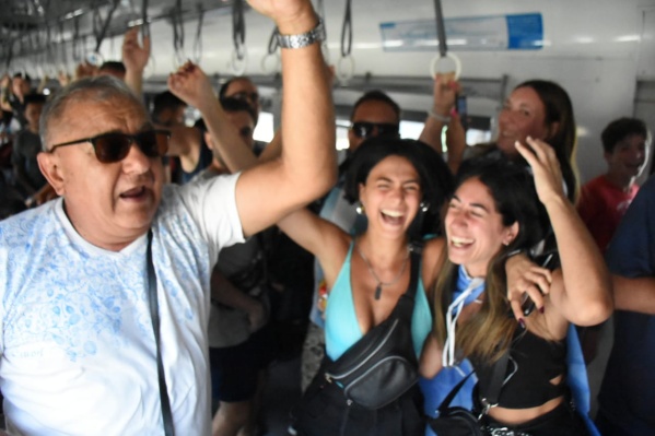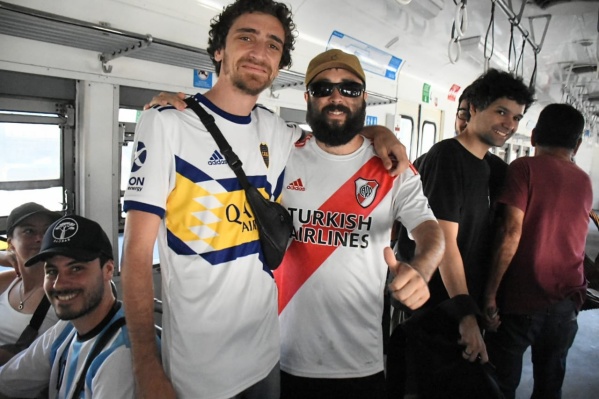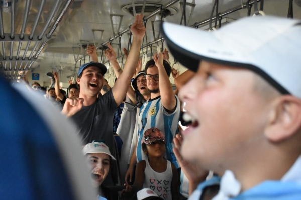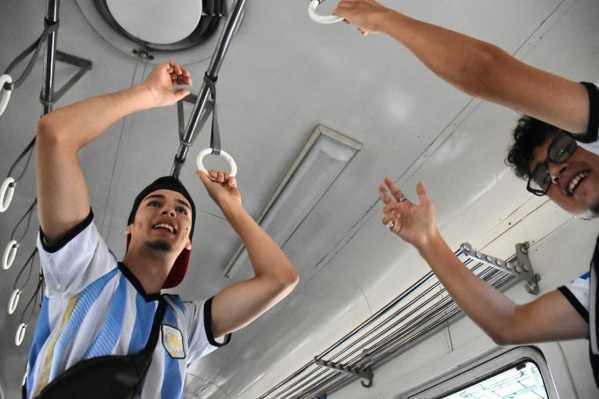 Las banderas y camisetas de la albiceleste decoran el tren que va rumbo hacia Constitución, donde finaliza el recorrido. Los hinchas se preparan para tratar de llegar a la movilización multitudinaria e histórica que estamos viviendo.