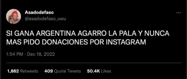 En ese sentido, una influencer conocida en Twitter como "Asadodefaso", publicó en la red social del pajarito cuál había sido su particular promesa: "SI GANA ARGENTINA AGARRO LA PALA Y NUNCA MÁS PIDO DONACIONES POR INSTAGRAM", había escrito.